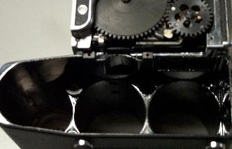The drive gear is connected to the one that has the little screw (as seen from the back of the camera). This screw you can use to cock the lens if it is inadvertently released. Remember you cannot remove the lens unless the shutter is cocked. You can just see the end of that screw in the center of the mirror.