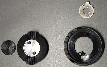 Viewed from the front, note the round white (Teflon) bushing. This is what releases the bajonet when the lens release button is pressed. Don't forget to put it back on its center pin when you perform the reassembly.