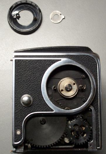 Now for a look into one of the more (in)famous parts of a Hasselblad: the shutter drive mechanism. The shutter drive mechanism is covered by a truly thin metal cover. Once removed you can see shaft that cocks and releases the shutter.